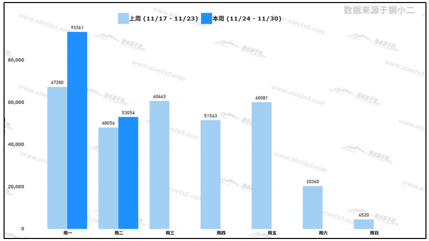 据钢小二平台样本数据,11月25日采样全国工程需求量为53,054吨,环比上个交易日下降43%。