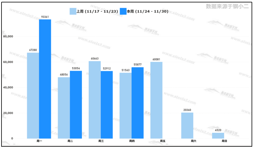 据钢小二平台样本数据,11月27日采样全国工程需求量为55,877吨,环比上个交易日上涨5.6%。