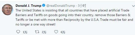 特朗普在推特中表示:“美国坚持要求所有对进入本国的货物设置人为贸易壁垒和关税的国家取消这些壁垒和关税,否则别指望美国给予互惠。贸易必须是公平的,不再是单行道!”
