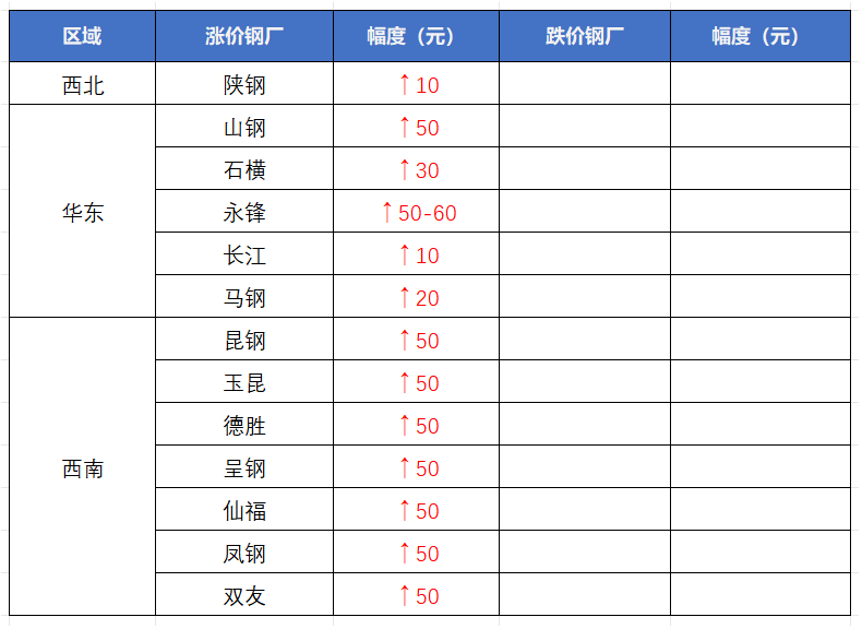 3、调价钢企全线上调