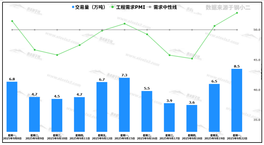 据钢小二平台样本数据,9月22日采样全国工程需求量为8.5万吨,环比上个交易日上涨30%,工程需求PMI为52.8,日环比上升2.2个百分点。