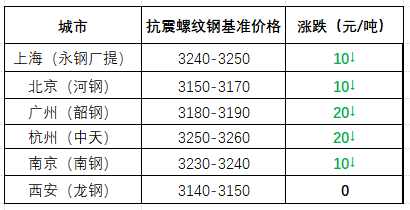 今日行情走势为松动出货,据西本跟踪统计的69个城市建材报价,开盘下跌市场占比61%,39%市场持平,午后低位整理;截至收盘,上海、杭州、南京等地主导资源价格下跌10-20元/吨。据上海市场反馈,今天库提小厂抗震螺纹钢高低区间在3130-3160元,厂提永钢螺纹钢基价区间在3210-3220元/吨。