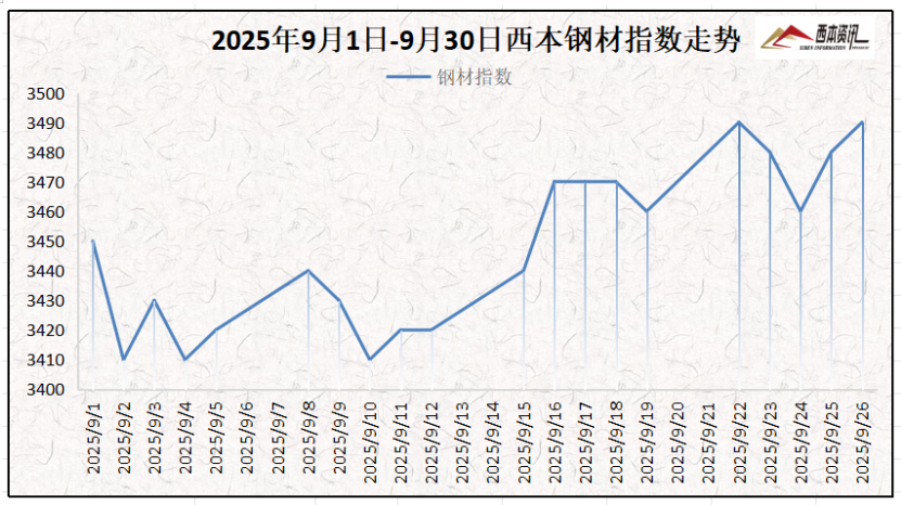 截止9月26日,西本钢材指数收在3490,较上月末下跌10;较去年同期价格下跌90,同比下跌2.5%。