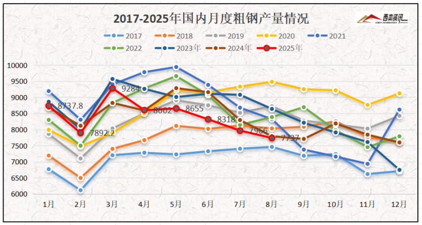 从钢厂生产情况来看,国家统计局数据显示,2025年8月,中国粗钢产量7737万吨,同比下降0.7%;生铁产量6979万吨,同比增长1.0%;钢材产量12277万吨,同比增长9.7%。1-8月,中国粗钢产量67181万吨,同比下降2.8%;生铁产量57907万吨,同比下降1.1%;钢材产量98217万吨,同比增长5.5%。