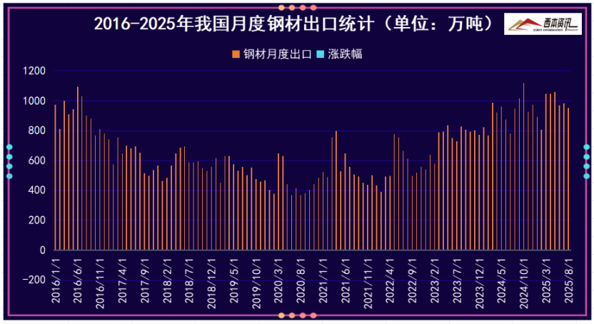 海关总署数据显示,2025年8月中国出口钢材951.0万吨,较上月减少32.6万吨,环比下降3.3%;1-8月累计出口钢材7749.0万吨,同比增长10.0%。8月中国进口钢材50.0万吨,较上月增加4.8万吨,环比增长10.6%;1-8月累计进口钢材397.7万吨,同比下降14.1%。