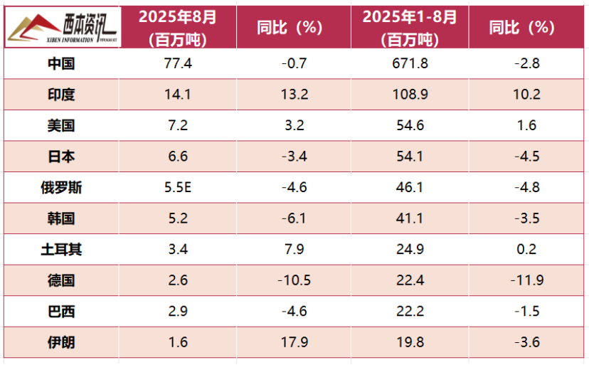 2025年8月,中国粗钢产量为7737万吨,同比下降0.7%;印度粗钢产量为1410万吨,同比增长13.2%;美国粗钢产量为720万吨,同比增长3.2%;日本粗钢产量为660万吨,同比下降3.4%;俄罗斯粗钢预估产量为550万吨,同比下降4.6%;韩国粗钢产量为520万吨,同比下降6.1%;土耳其粗钢产量为340万吨,同比增长7.9%;德国粗钢产量为260万吨,同比下降10.5%;巴西粗钢产量为290万吨,同比下降4.6%;伊朗粗钢产量为160万吨,同比增长17.9%。