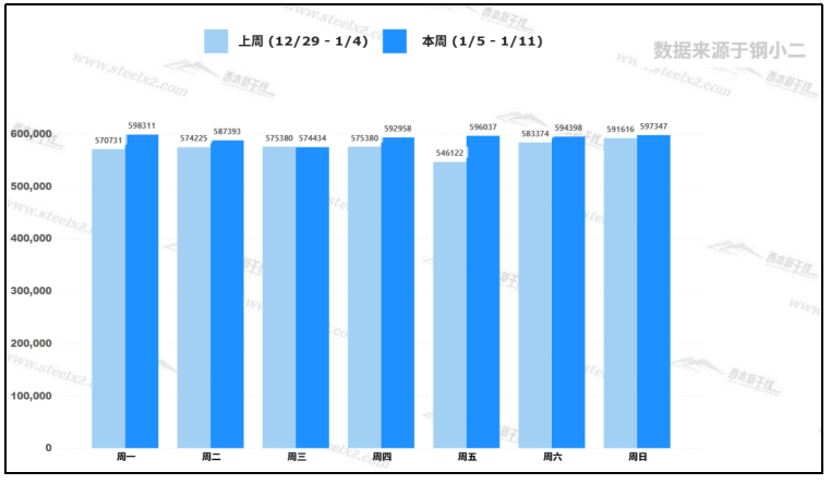 据钢小二平台样本数据,1月9日建筑钢材社会库存量为596,037吨,较前一交易日库存增加0.5%。