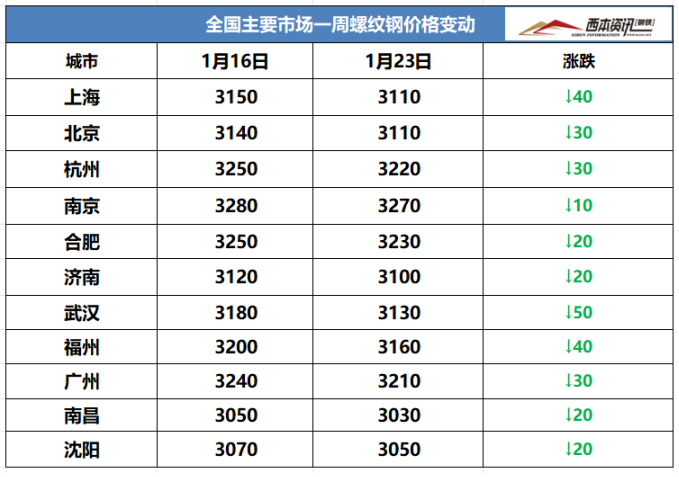(1)上周国内建筑钢材行情偏弱调整,截至1月23日,西本指数报在3470,周环比下跌30。