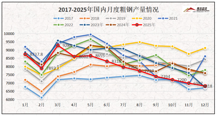 3、2025年中国粗钢产量为96081万吨,同比下降4.4%;