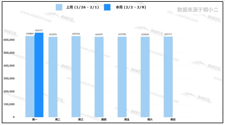 据钢小二平台样本数据,2月2日建筑钢材社会库存量为656137吨,较上个交易日增加4.6%。