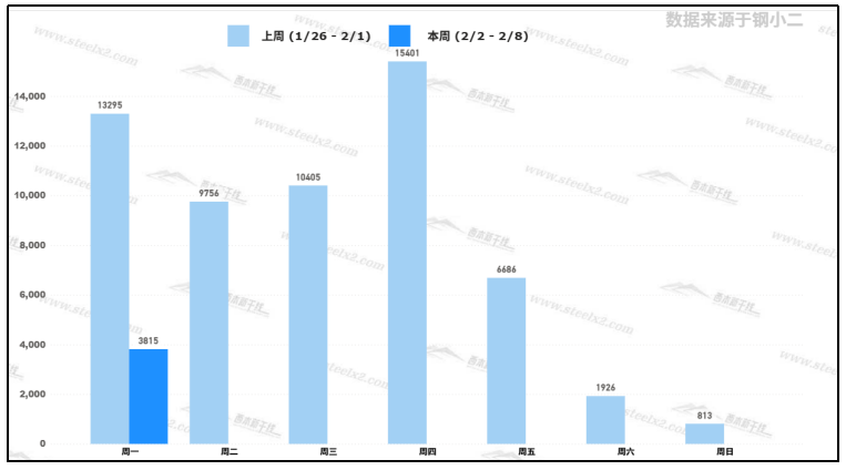 据钢小二平台样本数据,2月2日采样全国工程需求量为3815吨,较上个交易日下降42%。
