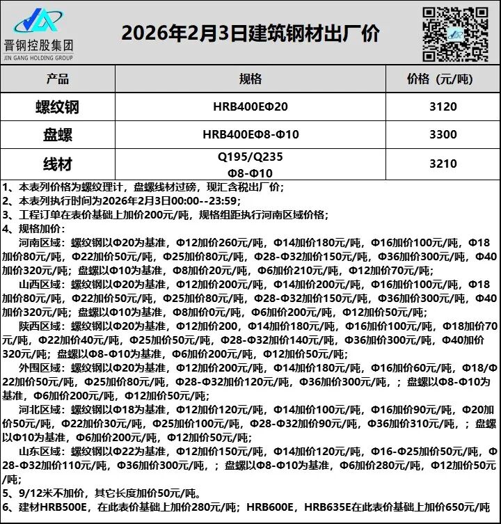 摘要:2月3日山西晋钢建筑钢材出厂价格