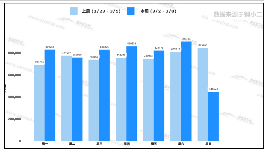 据钢小二平台样本数据,3月6日建筑钢材社会库存量为860,231吨,较上个交易日库存下降4.5%。