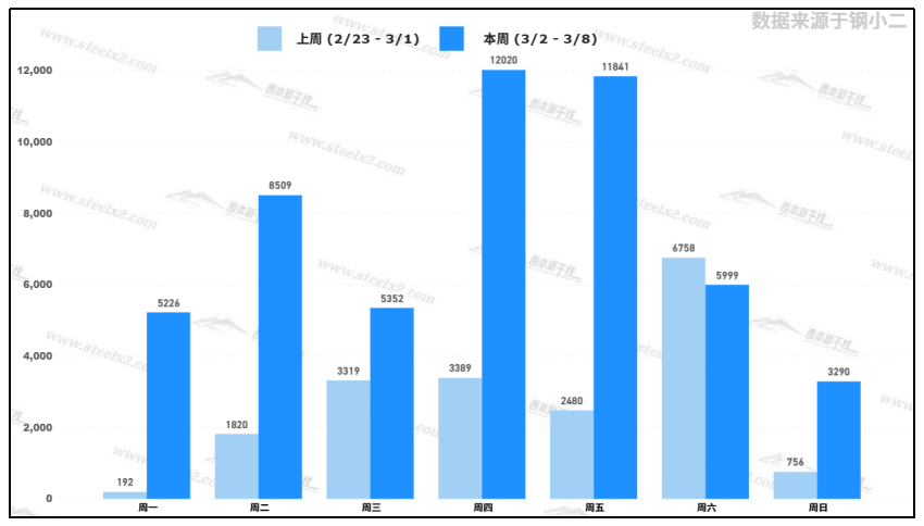 据钢小二平台样本数据,3月6日采样全国工程需求量为11,841吨,较上个交易日下降1.4%。