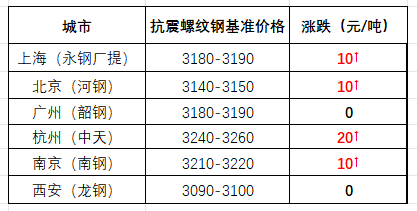 今日行情为小幅上调,据西本跟踪统计的69个城市建材报价,开盘86%市场上涨,14%区域持平,午后横盘为主;截至收盘,上海、杭州、南京等地主导资源价格环比上涨10-20元/吨。据上海市场反馈,今天库提小厂抗震螺纹钢高低区间在3110-3130元,厂提永钢螺纹钢基价区间在3150-3160元/吨。