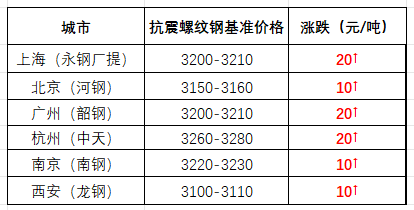 截至午间,国内部分市场螺纹钢(抗震)基价如下:上海市场3200-3210元/吨;北京市场3150-3160元/吨;广州市场3200-3210元/吨;杭州市场3260-3270元/吨;南京市场3220-3230元/吨;西安市场3100-3110元/吨。环比来看,截至午间收盘,全国主要市场一线品牌价格调高。