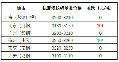 截至午间,国内部分市场螺纹钢(抗震)基价如下:上海市场3200-3210元/吨;北京市场3160-3170元/吨;广州市场3200-3210元/吨;杭州市场3250-3260元/吨;南京市场3220-3230元/吨;西安市场3100-3110元/吨。环比来看,截至午间收盘,全国主要市场一线品牌价格稳中微调。