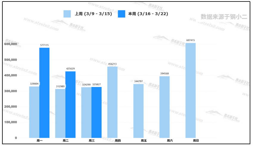 据钢小二平台样本数据,3月18日建筑钢材社会库存量为325,827吨,较上个交易日库存量下降23%。