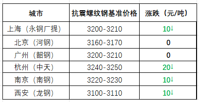 今日行情为松动成交,据西本跟踪统计的69个城市建材报价,开盘31%市场持平,68%区域下跌,午后更多持稳;截至收盘,上海、杭州、南京等地主导资源价格环比下跌10-20元/吨。据上海市场反馈,今天库提小厂抗震螺纹钢高低区间在3100-3130元,厂提永钢螺纹钢基价区间在3170-3180元/吨。