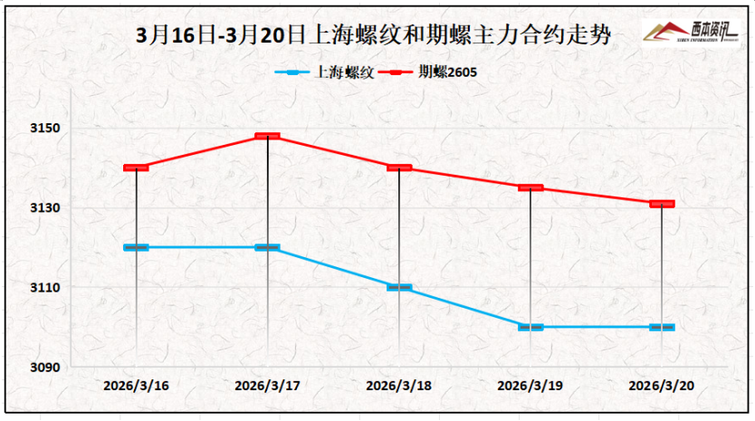 (2)钢材供需两端双增,叠加中东地缘纷争扰动,盘面走势摇摆不定,多空势力博弈激烈,期螺合约上下振幅有限,截至3月20日午后,螺纹2605主力合约报在3128,周环比下降14。