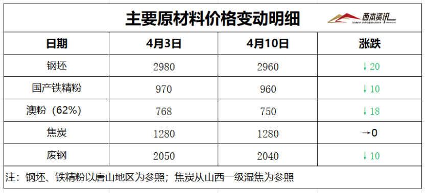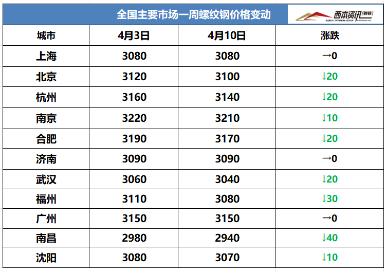 (1)本周国内建筑钢材行情窄幅波动,截至4月10日,西本指数报在3430,周环比下跌10。