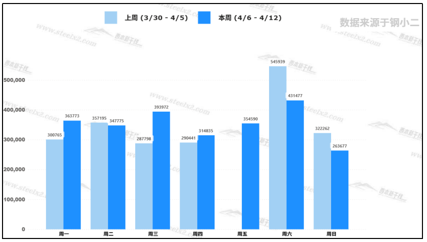 据钢小二平台样本数据,4月10日建筑钢材社会库存量为354,590吨,较上一个交易日库存增加12%。