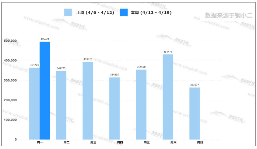 据钢小二平台样本数据,4月13日建筑钢材社会库存量为496,221吨,较上一个交易日库存上升。