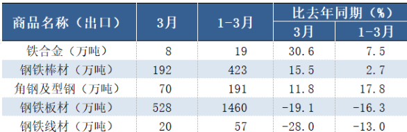 3月,中国出口钢铁棒材192万吨,同比增长15.5%;1-3月累计出口423万吨,同比增长2.7%。其他出口情况如下表所示: